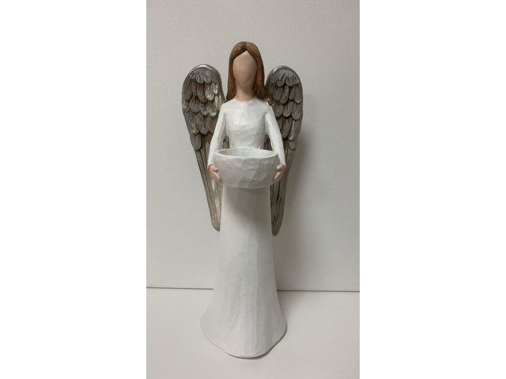 Krásný keramický anděl s jemnými detaily, který ve svých rukách drží svícen na čajovou svíčku.