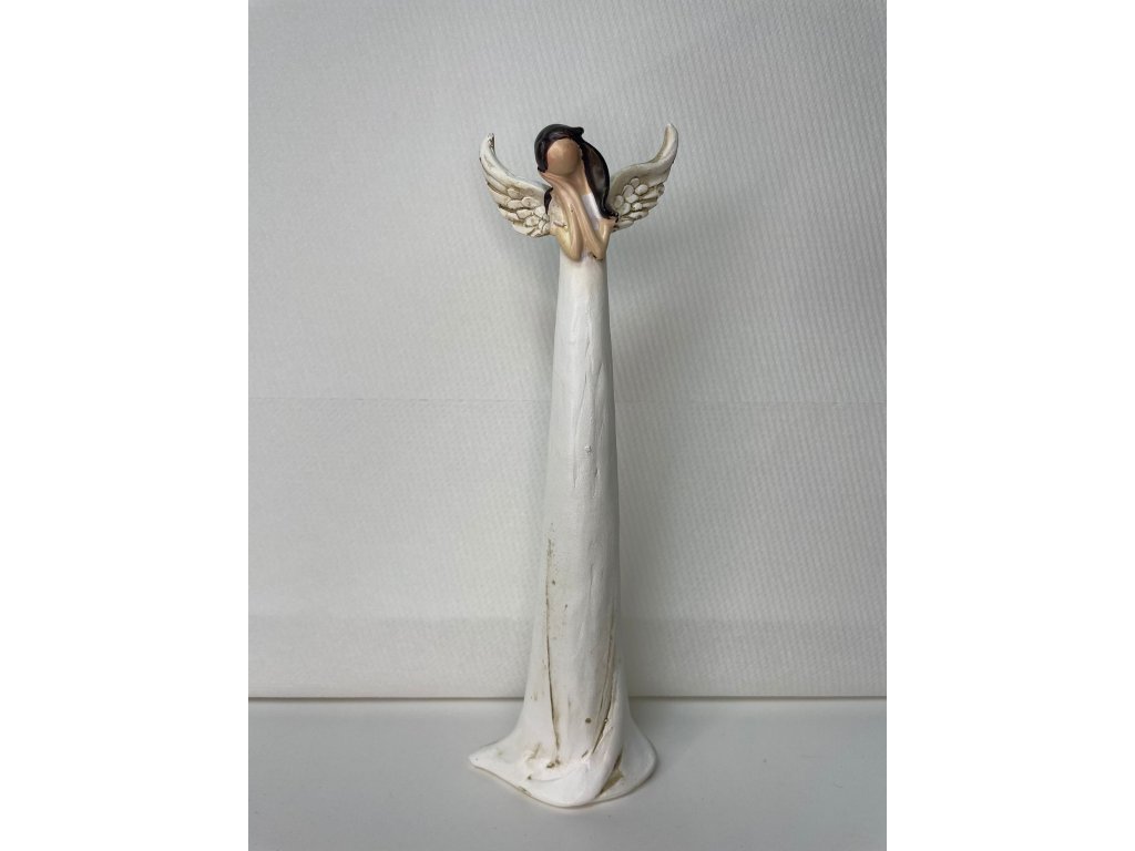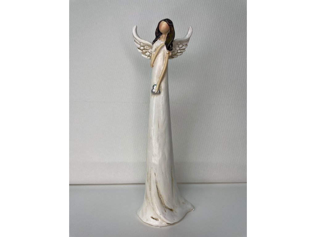 Jemný anděl v přírodních barvách, který v rukou drží srdce jako symbol lásky a ochrany. Díky menší velikosti se hodí na polici, stůl nebo jako drobná dekorace, která dodá domovu klidnou a harmonickou atmosféru.